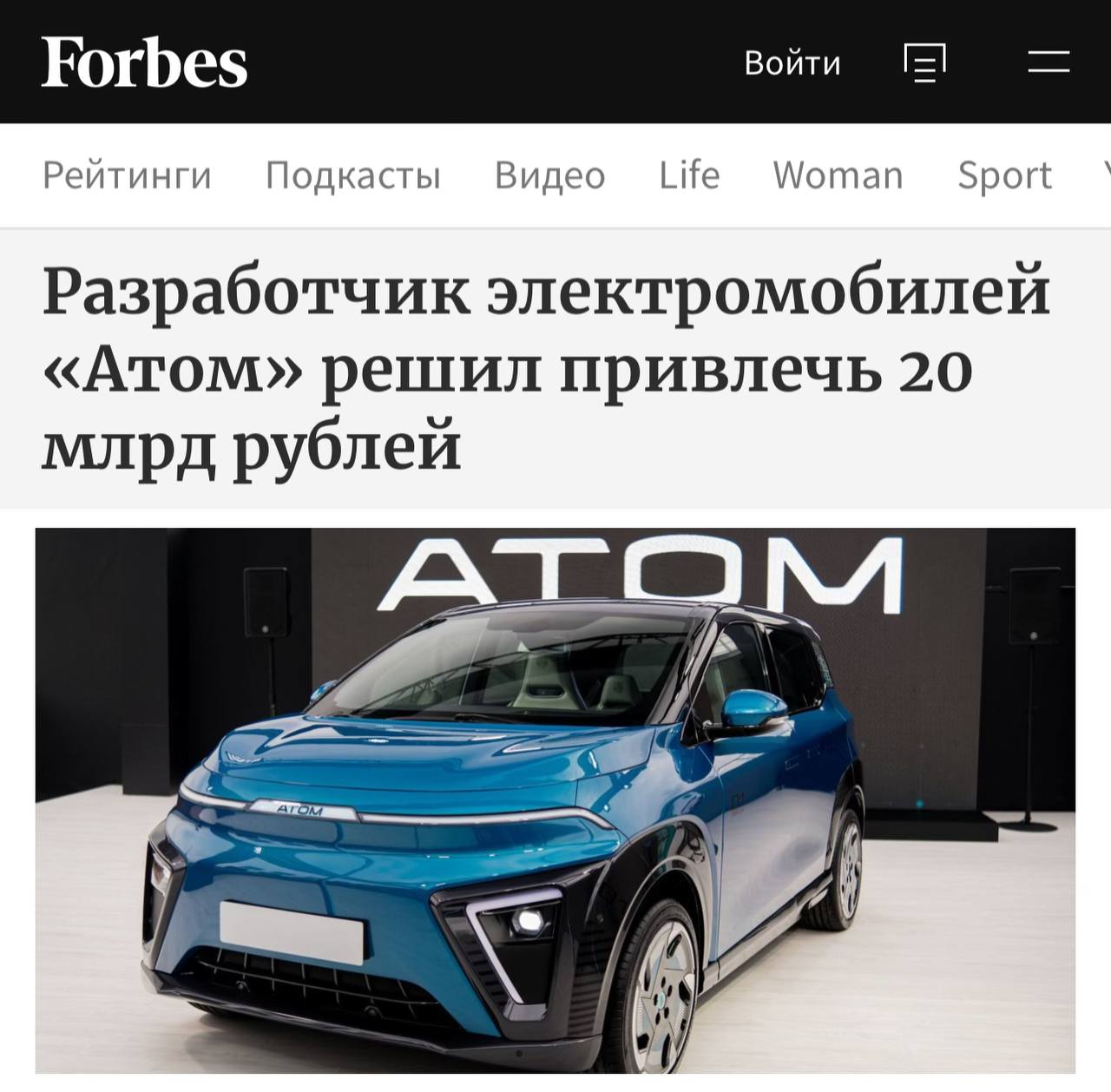 Стартап «Атом» ищет ₽20 миллиардов для запуска производства электромобилей